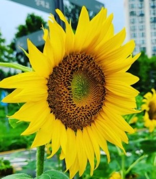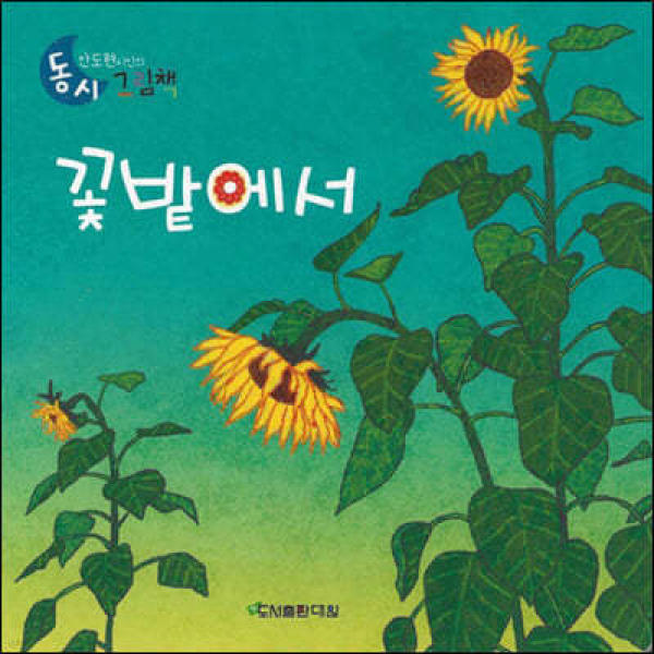 딸랑구가 해바라기 사진을 보고 웃고 있어요.